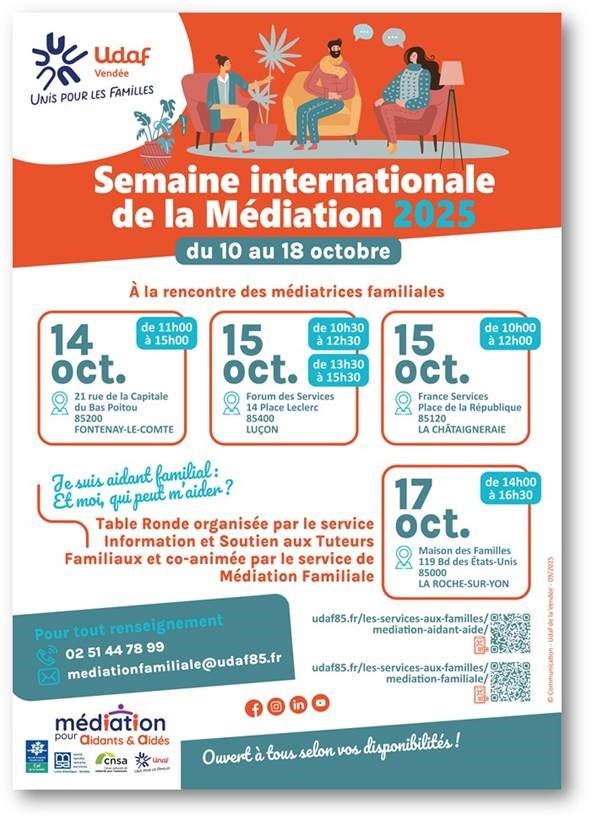 Dans le cadre de la semaine internationale de la Médiation 2025, les médiatrices familiales de l’UDAF de la Vendée vous invitent à leur rencontre dans le Sud Vendée :