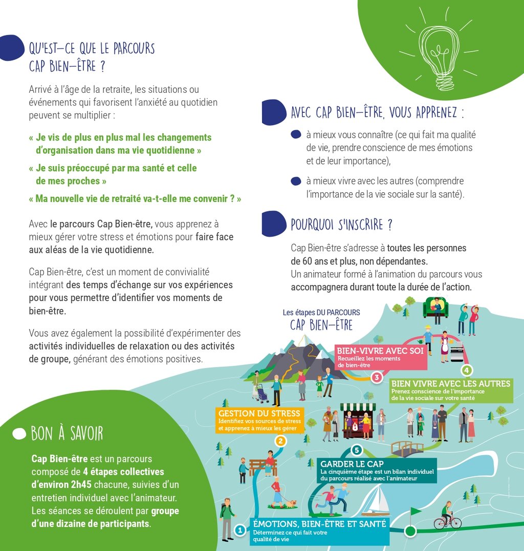 Afin de favoriser le bien-être et la bonne santé mentale à tout âge de la vie, un cycle de 4 séances CAP Bien-Etre est proposé aux séniors du territoire.