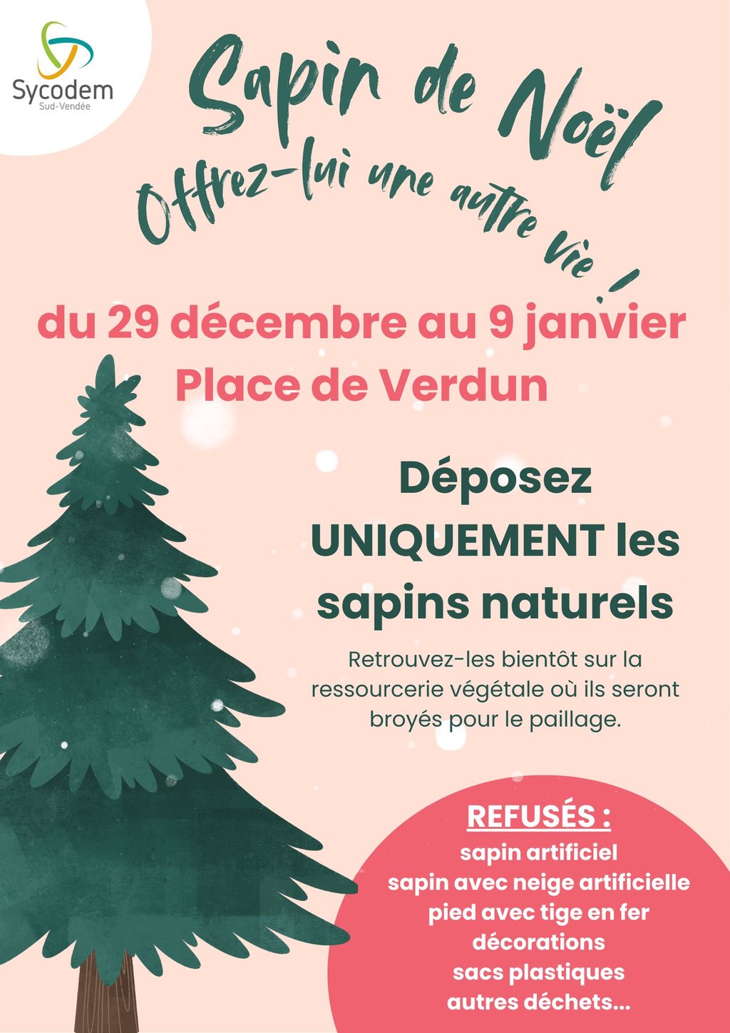 Déposez votre sapin naturel (sans sacs, décorations, tige de soutien, etc) dans la benne Place de Verdun à Fontenay-le-Comte. Il sera broyé plus tard sur la ressourcerie végétale pour servir de paillage.