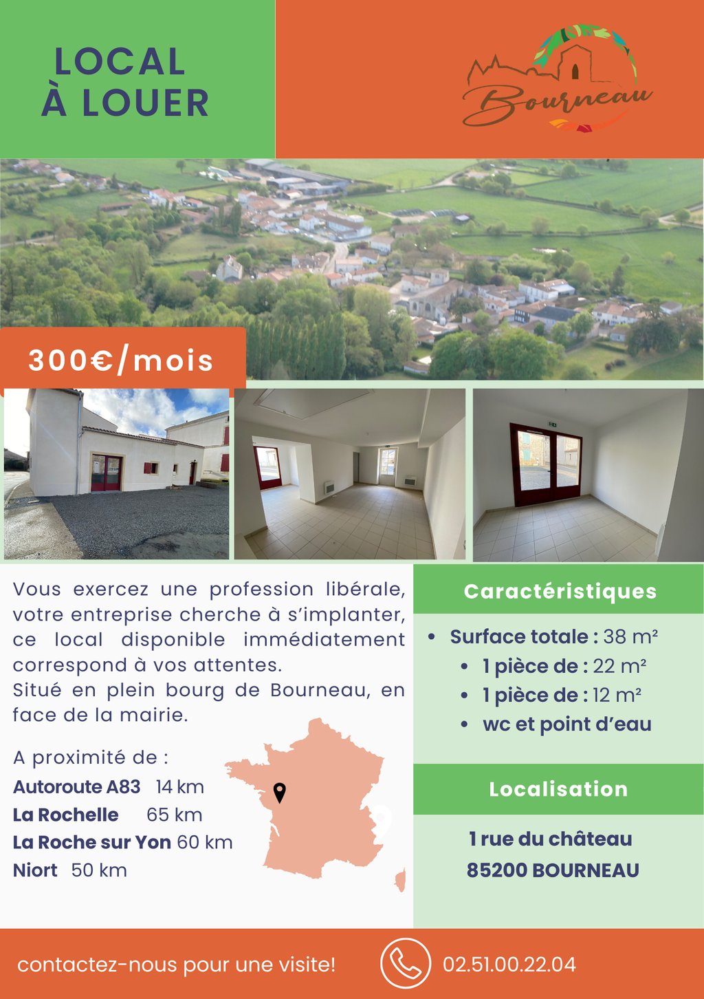 Venez découvrir ce local d’environ 38 m² situé au rez-de-chaussée dans le bourg de Bourneau.