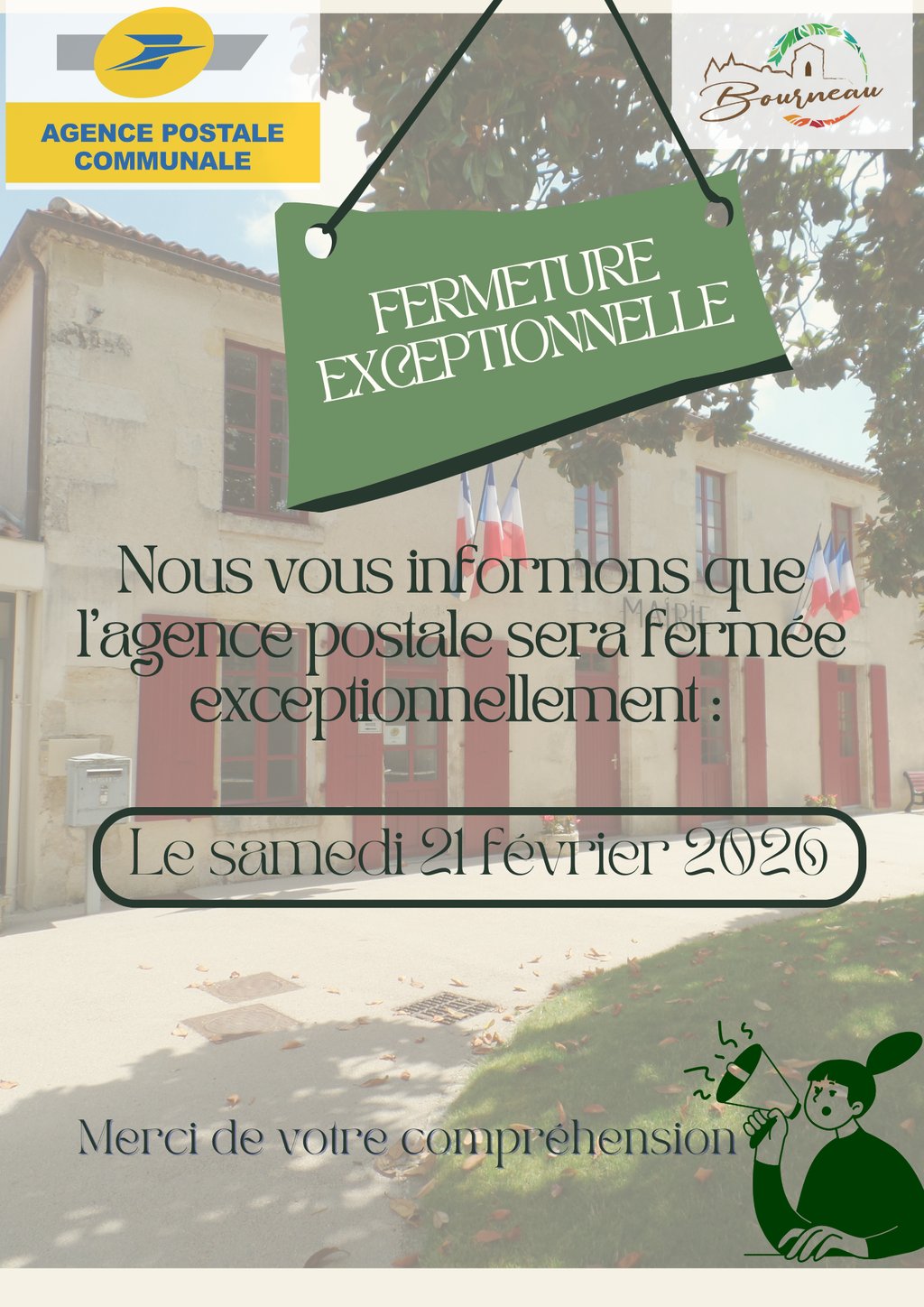 L'agence postale Communale sera fermée exceptionnellement le samedi 21 février 2026.