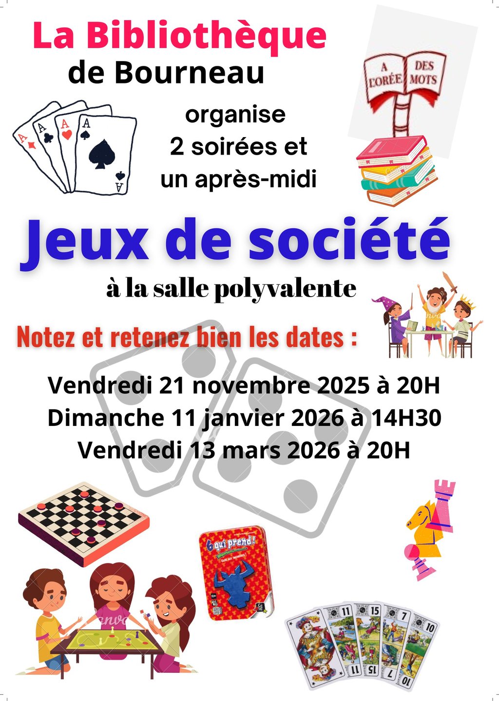 La bibliothèque "L'Orée des mots" vous invite à participer aux soirées jeux qu'elle organise à la salle polyvalente.