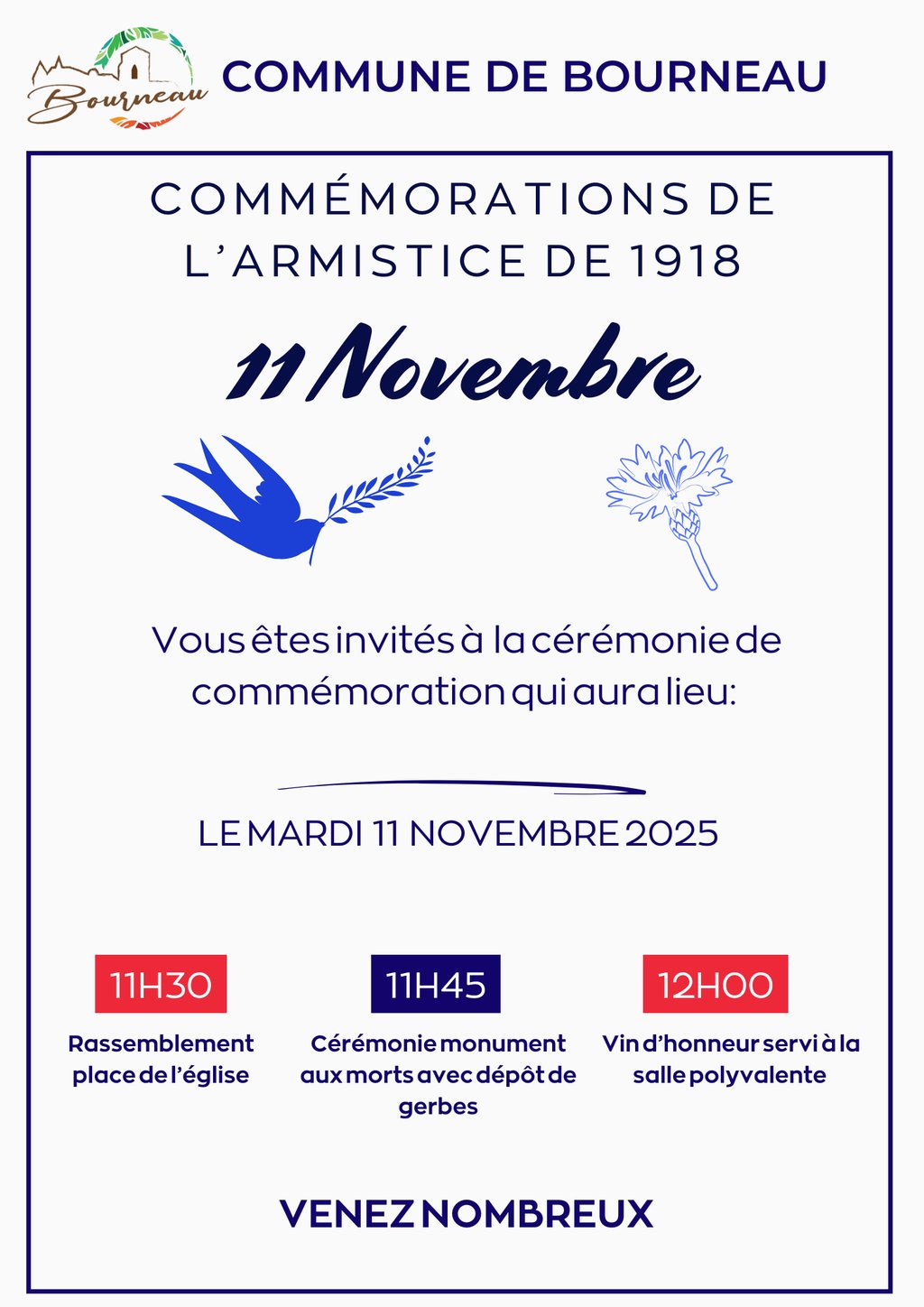 Monsieur le Maire, ainsi que le Conseil Municipal de Bourneau vous convient à la cérémonie commémorative de l'armistice du 11 novembre 1918.