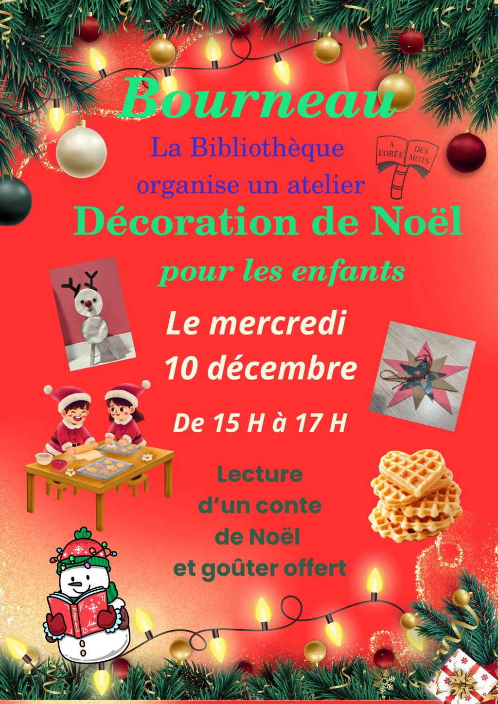 Un atelier Décoration de Noël pour les enfants est organisé par la bibliothèque, le mercredi 10 décembre de 15 H à 17 H. Tous les enfants sont invités à se retrouver dans une ambiance festive pour fabriquer leurs propres créations de Noël qu’ils rapporteront à la maison. Un conte de Noël sera lu à la bibliothèque et avant de se quitter un goûter sera servi à tous les participants.