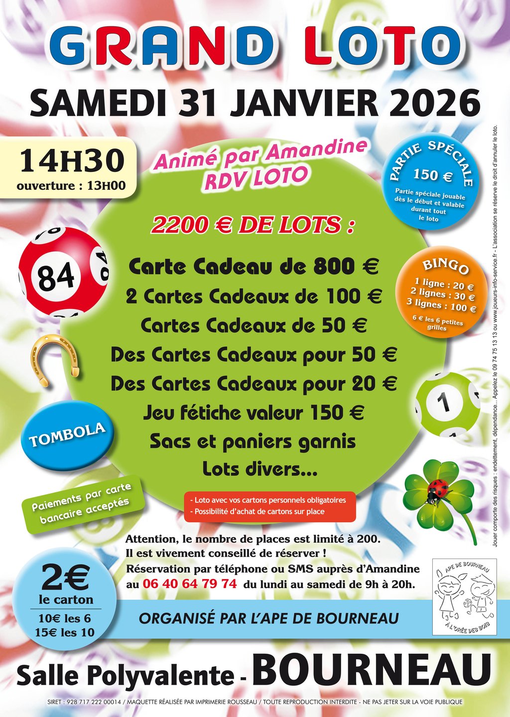 L'APE organise un grand loto le samedi 31 janvier à la salle des fêtes de Bourneau.