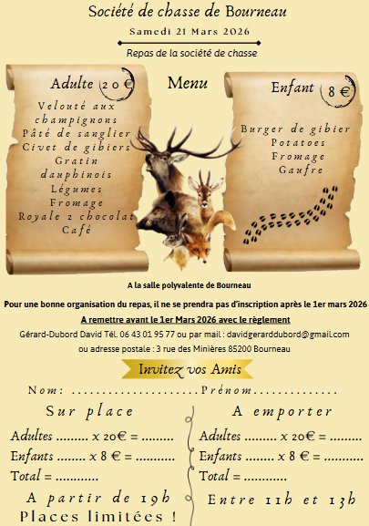 La société de chasse de Bourneau vous propose un repas convivial le 21 Mars 2026, à emporter ou sur place.