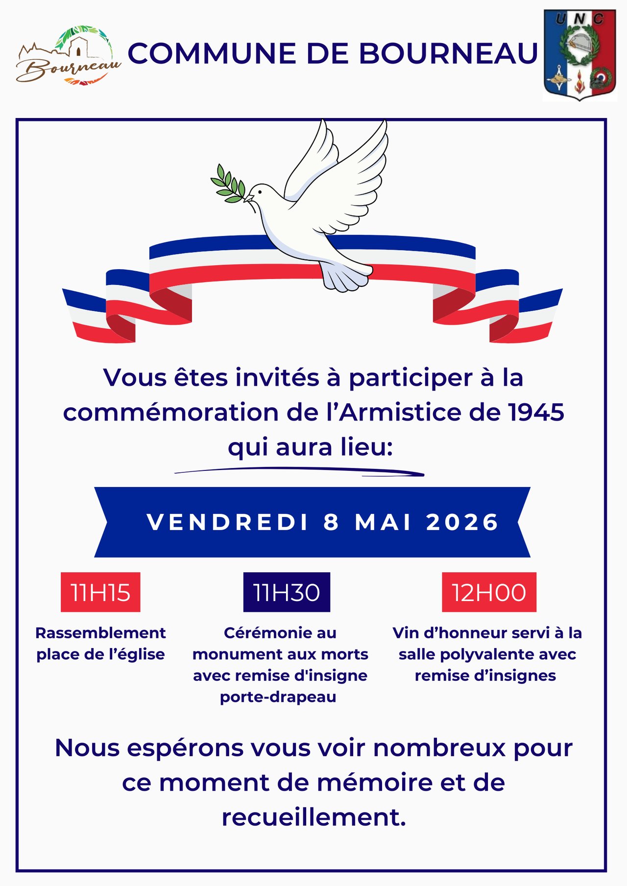 Nous avons l’honneur de vous convier à la cérémonie commémorative qui se tiendra le vendredi 8 mai à 11h30.